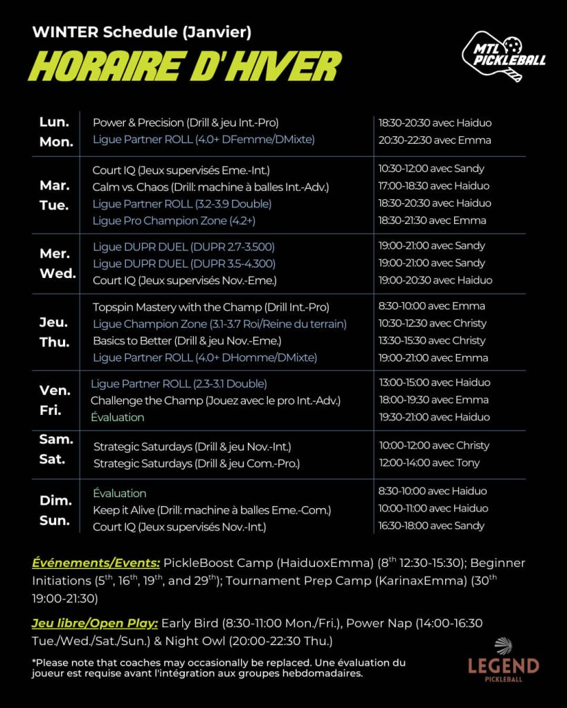 Activitiesmtlpickleball25cr2025-12-28T20:13:54-05:00 Activities Calendar Choose your upcoming session: Evaluation Group Lessons Supervised Games Leagues