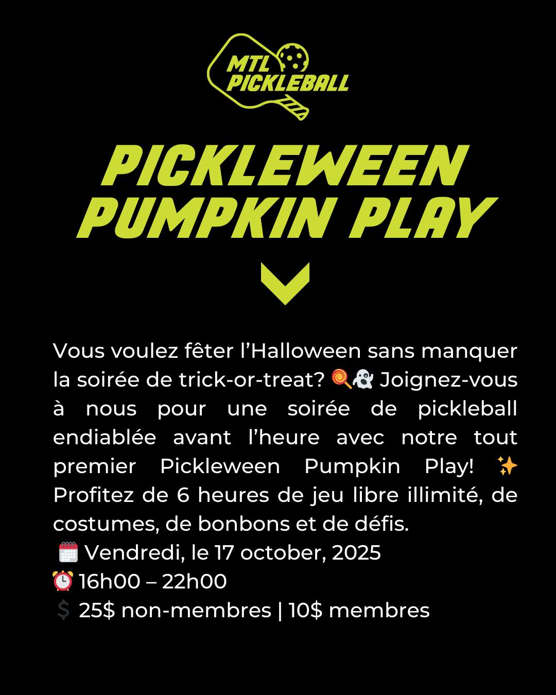Joignez-vous à nous pour une soirée de pickleball endiablée avant l’heure avec notre tout premier Pickleween Pumpkin Play ! Profitez de 6 heures de jeu libre illimité, de costumes, de bonbons et de défis.