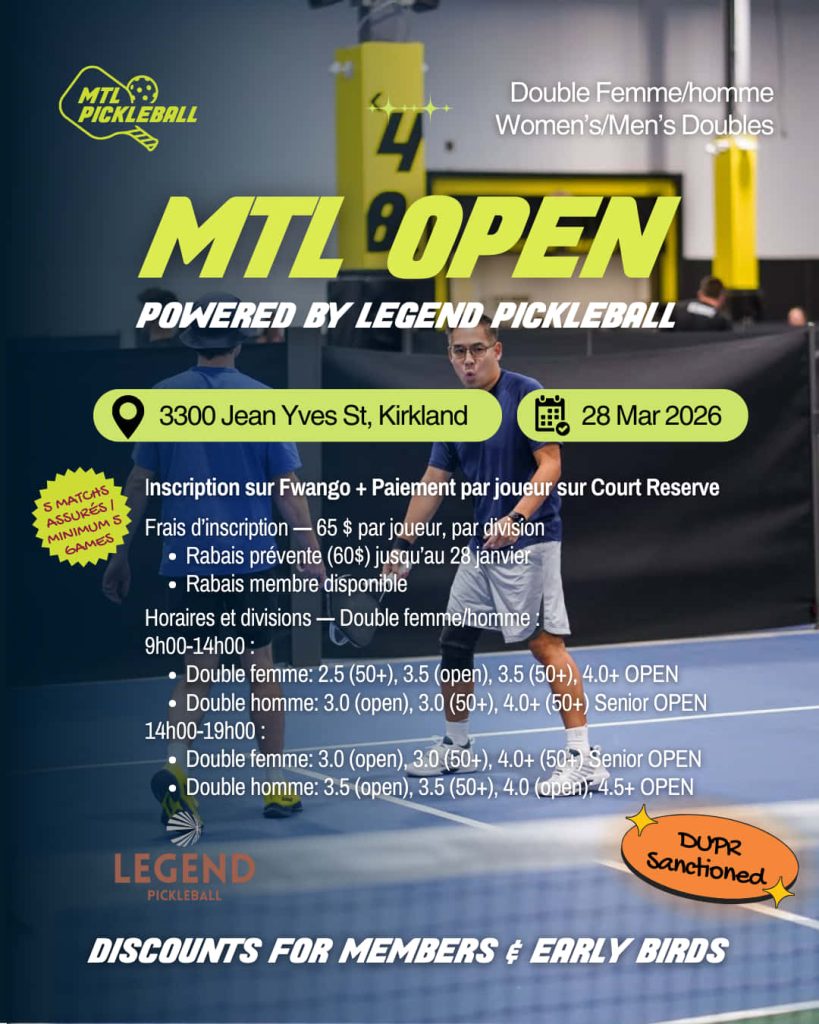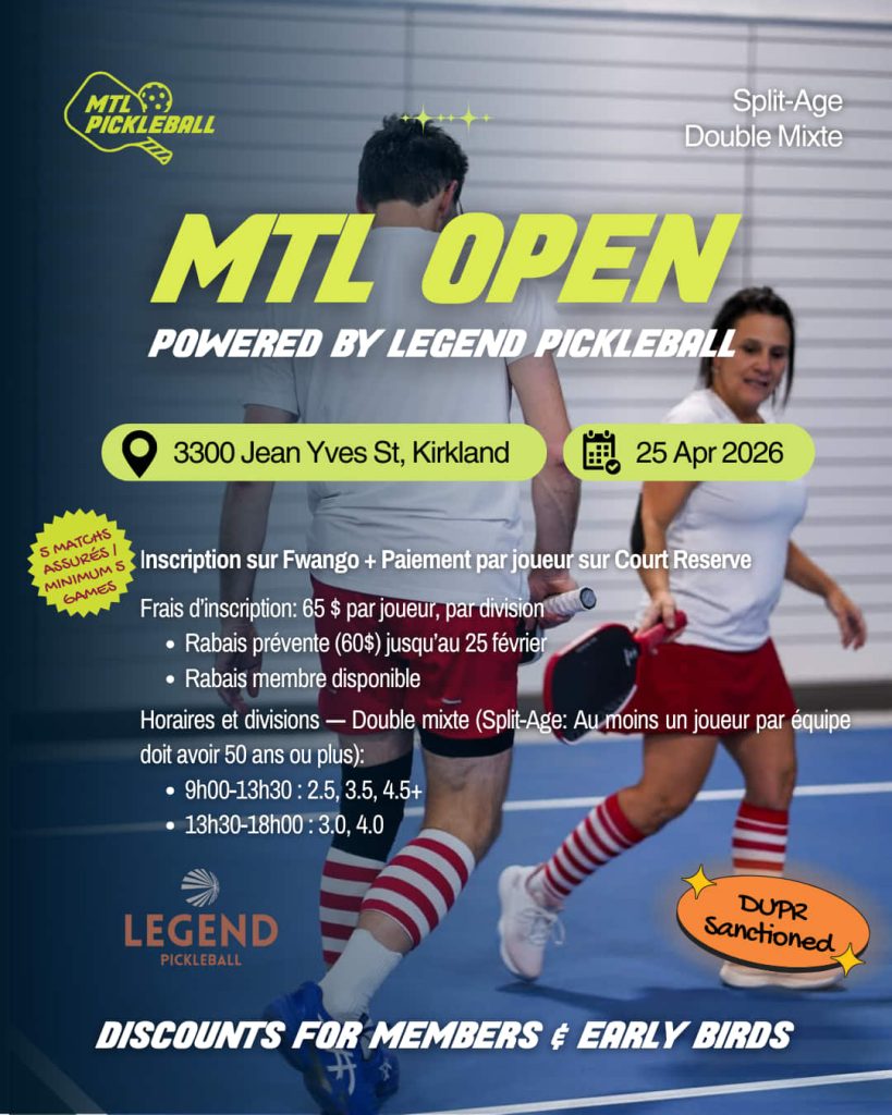 The MTL Open Powered by Legend Pickleball is an exciting 8-event tournament series designed for players who want competition and atmosphere. Across all stops, teams enjoy a unique format, minimum guaranteed matches, and the chance to earn medals at every event. Plus, players collect points throughout the season for special end-of-series perks and rewards. Join the fun, compete hard, and experience one of the most dynamic pickleball circuits in Montreal!